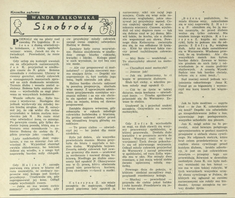 Archiwum / Kronika sądowa nr 745 (29/1959) 24/43 Podziel się Tytuł Sinobrody Autor Wanda Falkowska Rubryka Kronika sądowa Artykuł z numeru 745 (29/1959) Data wydania 19 lipca 1959