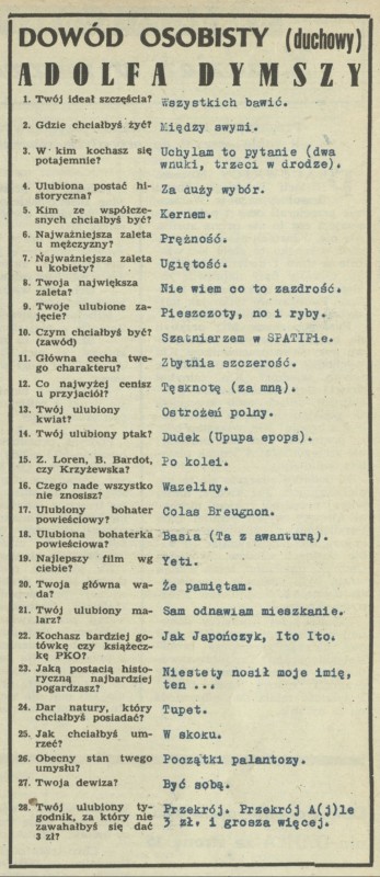 Archiwum / Dowód osobisty (duchowy) nr 901 (28/1962) 51/193 Podziel się Tytuł Dowód osobisty (duchowy) Adolfa Dymszy Autor Adolf Dymsza Rubryka Dowód osobisty (duchowy) Artykuł z numeru 901 (28/1962) Data wydania 15 lipca 1962 Tagi zabawa pytania kwestionariusz ankieta