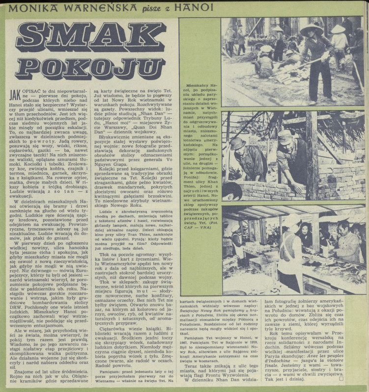 Archiwum / korespondencja własna "Przekroju" nr 1454 (07/1973) 25/163 Podziel się Tytuł Smak pokoju Autor Monika Warneńska Rubryka korespondencja własna "Przekroju" Artykuł z numeru 1454 (7/1973) Data wydania 18 lutego 1973 Tagi wietnam Hanoi społeczeństwo