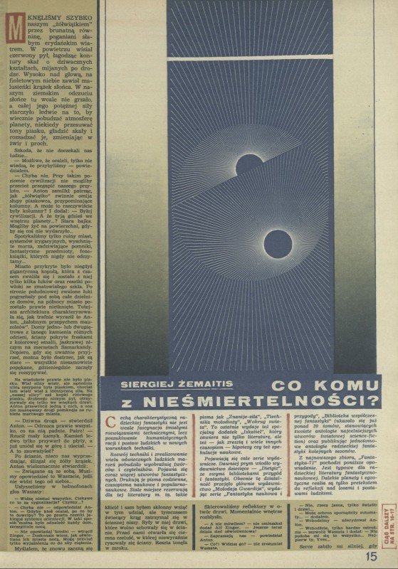Archiwum / Artykuł nr 1453 (06/1973) 59696/123969 Podziel się Tytuł Co komu z nieśmiertelności? Autor Siergiej Żemaitis Kategoria Artykuł Artykuł z numeru 1453 (6/1973) Data wydania 11 lutego 1973