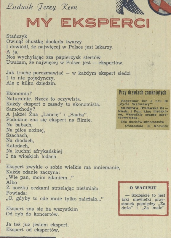 Archiwum / Rozmaitości [old] nr 1461 (14/1973) 14/53 Podziel się Tytuł My eksperci Autor Ludwik Jerzy Kern Rubryka Rozmaitości [old] Artykuł z numeru 1461 (14/1973) Data wydania 8 kwietnia 1973