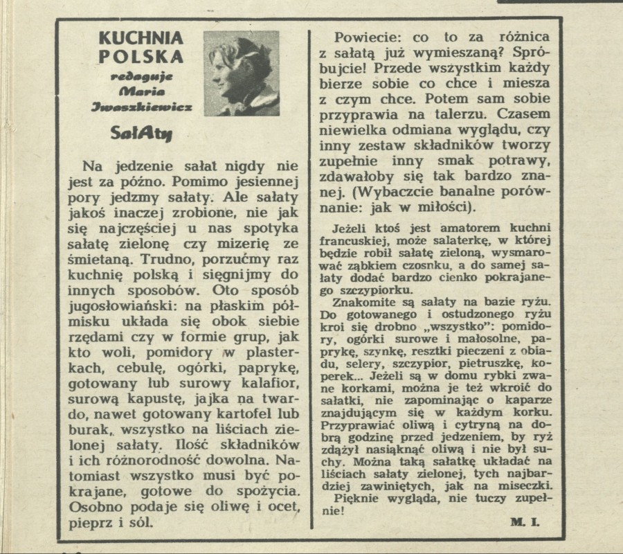 Archiwum / Kuchnia Polska nr 911 (38/1962) 38162/123969 Podziel się Tytuł SałAty Autor Maria Iwaszkiewicz Rubryka Kuchnia Polska Artykuł z numeru 911 (38/1962) Data wydania 23 września 1962 Tagi kuchnia przepisy porady zdrowie