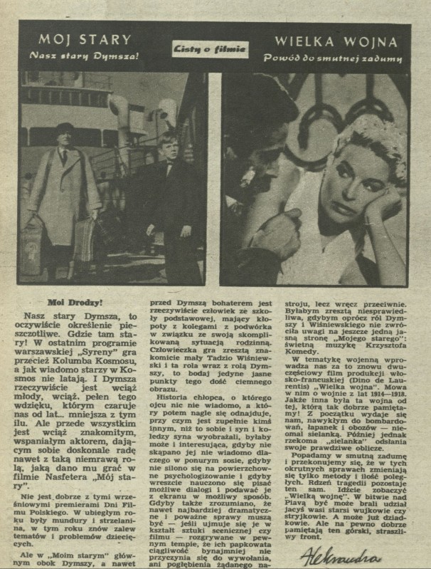Archiwum / Listy o filmie nr 911 (38/1962) 85817/123969 Podziel się Tytuł Mój stary i Wielka Wojna Autor Aleksandra Rubryka Listy o filmie Artykuł z numeru 911 (38/1962) Data wydania 23 września 1962 Tagi film kinematografia repertuar recenzja nowości aktorzy gwiazdy