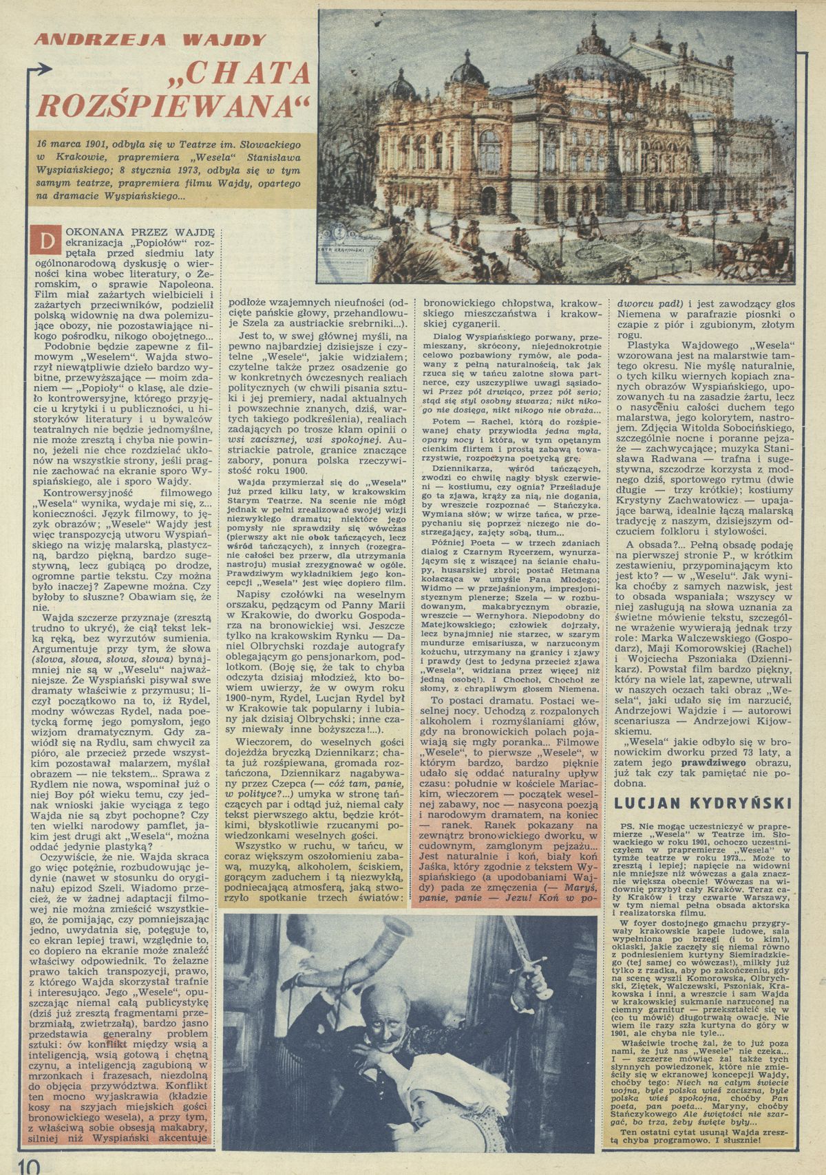 Archiwum / Artykuł nr 1450 (03/1973) 131/3075 Podziel się Tytuł Andrzeja Wajdy „Chata rozśpiewana” Autor Lucjan Kydryński Kategoria Artykuł Artykuł z numeru 1450 (3/1973) Data wydania 21 stycznia 1973 Tagi film
