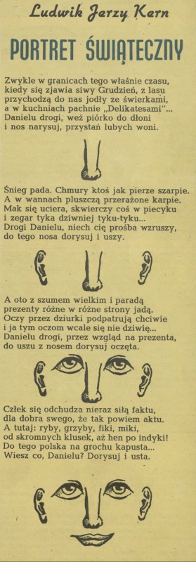 Archiwum / Rozmaitości [old] nr specjalny 51/1956 07/36 Podziel się Tytuł Portret świąteczny Autor Ludwik Jerzy Kern Rubryka Rozmaitości [old] Artykuł z numeru nr specjalny 51/1956 Data wydania 23 grudnia 1956 Tagi wiersz grudzień święta bożego narodzenia wigilia