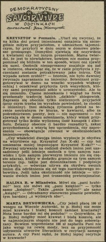 Archiwum / Demokratyczny savoir-vivre nr 172 (30/1948) 5140/123969 Podziel się Tytuł Demokratyczny savoir vivre Autor Jan Kamyczek Rubryka Demokratyczny savoir-vivre Artykuł z numeru 172 (30/1948) Data wydania 25 lipca 1948