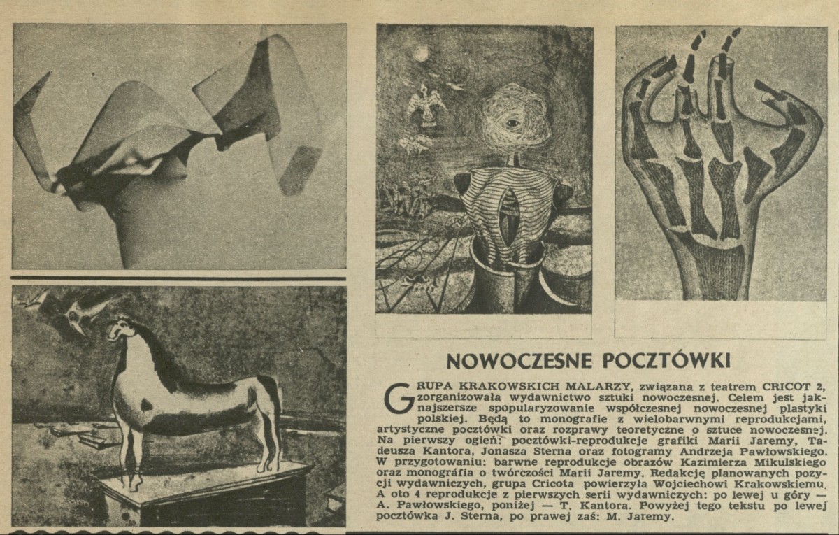 Archiwum / Kultura nr specjalny 51/1956 1/1 Podziel się Tytuł Nowoczesne pocztówki Kategoria Kultura Artykuł z numeru nr specjalny 51/1956 Data wydania 23 grudnia 1956 Tagi teatr Cricot 2 sztuka nowoczesna malarstwo
