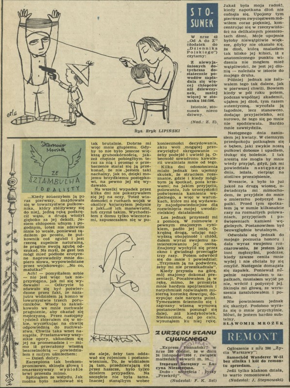 Archiwum / Sławomir Mrożek myśli, ze sztambucha idealisty nr specjalny 51/1956 13/13 Podziel się Tytuł Ze sztambucha idealisty Autor Sławomir Mrożek Rubryka Sławomir Mrożek myśli, ze sztambucha idealisty Artykuł z numeru nr specjalny 51/1956 Prawa Diogenes Verlag AG Data wydania 23 grudnia 1956 Tagi kobieta podryw