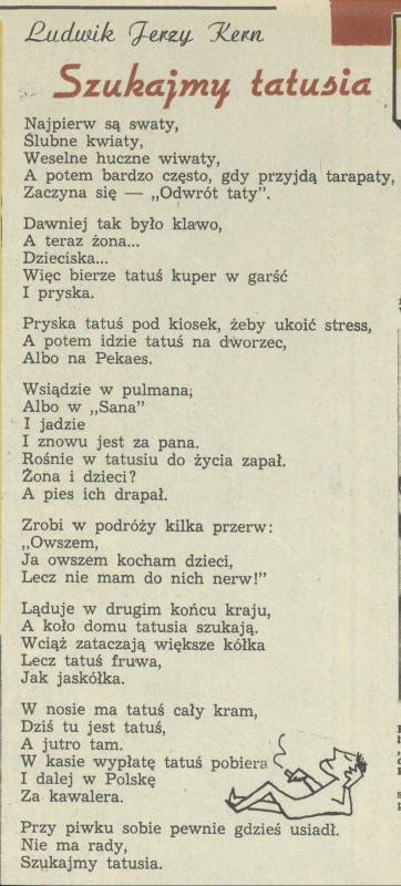 Archiwum / Rozmaitości [old] nr 1477 (30/1973) 57/96 Podziel się Tytuł Szukajmy tatusia Autor Ludwik Jerzy Kern Rubryka Rozmaitości [old] Artykuł z numeru 1477 (30/1973) Data wydania 29 lipca 1973