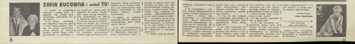 Archiwum / Wywiad nr 1465 (18/1973) 25/46 Podziel się Tytuł Zofia Kucówna i serial TV Autor Alina Budzińska Kategoria Wywiad Artykuł z numeru 1465 (18/1973) Data wydania 6 maja 1973 Tagi Opowieści mojej żony serial TV Zofia Kucówna