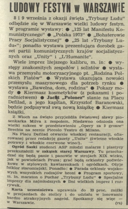 Archiwum / Kultura nr 1481 (34/1973) 61372/123969 Podziel się Tytuł Ludowy festyn w Warszawie Autor rs Kategoria Kultura Artykuł z numeru 1481 (34/1973) Data wydania 26 sierpnia 1973 Tagi kultura