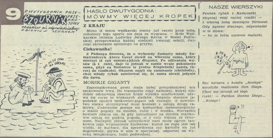 Archiwum / Różności nr 1490 (43/1973) 62061/123969 Podziel się Tytuł Dwutygodnik Przekrojowy: Bzdurnik Autor Zbigniew Lengren Kategoria Różności Artykuł z numeru 1490 (43/1973) Data wydania 28 października 1973 Tagi bzdurnik