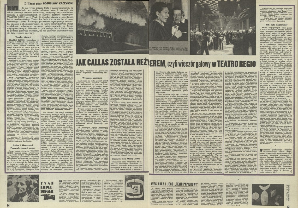 Archiwum / korespondencja własna "Przekroju" nr 1491 (44/1973) 267/823 Podziel się Tytuł Jak Callas została reżyserem Autor Bogusław Kaczyński Rubryka korespondencja własna "Przekroju" Artykuł z numeru 1491 (44/1973) Data wydania 4 listopada 1973