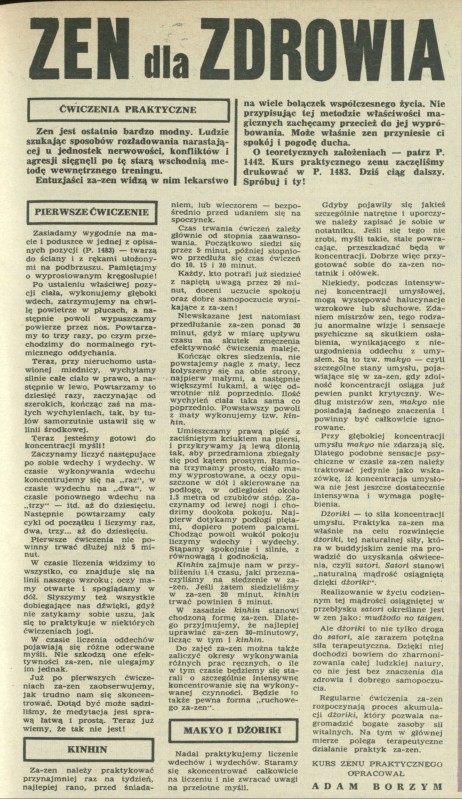 Archiwum / Artykuł nr 1484 (37/1973) 4/7 Podziel się Tytuł Zen dla zdrowia Autor Adam Borzym Kategoria Artykuł Artykuł z numeru 1484 (37/1973) Data wydania 16 września 1973 Tagi zdrowie