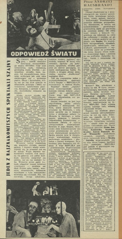 Archiwum / Artykuł nr 1497 (50/1973) 62308/123969 Podziel się Tytuł Odpowiedź światu Autor Andrzej Hausbrandt Kategoria Artykuł Artykuł z numeru 1497 (50/1973) Data wydania 16 grudnia 1973 Tagi teatr
