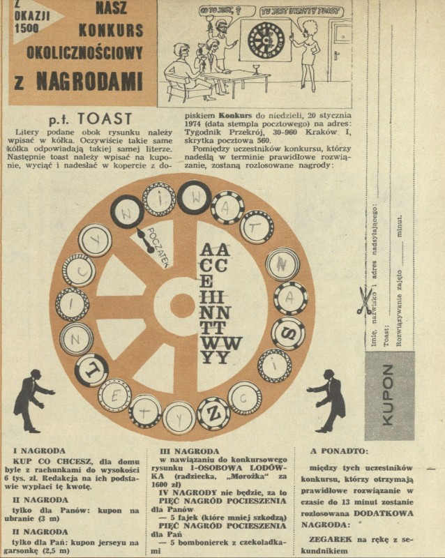 Archiwum / Konkurs nr 1500 (01/1974) 5/5 Podziel się Tytuł Z okazji 1500 nasz konkurs okolicznościowy z nagrodami p.t. Toast Rubryka Konkurs Artykuł z numeru 1500 (1/1974) Data wydania 6 stycznia 1974 Tagi jubileusz konkurs nagrody