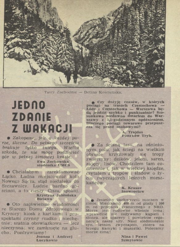 Archiwum / Społeczeństwo nr 1501 (02/1974) 13/18 Podziel się Tytuł Jedno zdanie z wakacji Kategoria Społeczeństwo Artykuł z numeru 1501 (2/1974) Data wydania 13 stycznia 1974 Tagi Tatry Zakopane