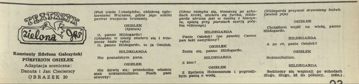 Archiwum / Teatrzyk Zielona Gęś nr 2090 (26/1985) 22/33 Podziel się Tytuł Porfirion Osiełek Autor Konstanty Ildefons Gałczyński Rubryka Teatrzyk Zielona Gęś Artykuł z numeru 2090 (26/1985) Data wydania 30 czerwca 1985