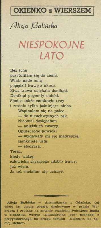 Archiwum / Okienko z wierszem nr 2092 (28/1985) 127/248 Podziel się Tytuł Niespokojne lato Autor Alicja Balińska Rubryka Okienko z wierszem Artykuł z numeru 2092 (28/1985) Data wydania 14 lipca 1985