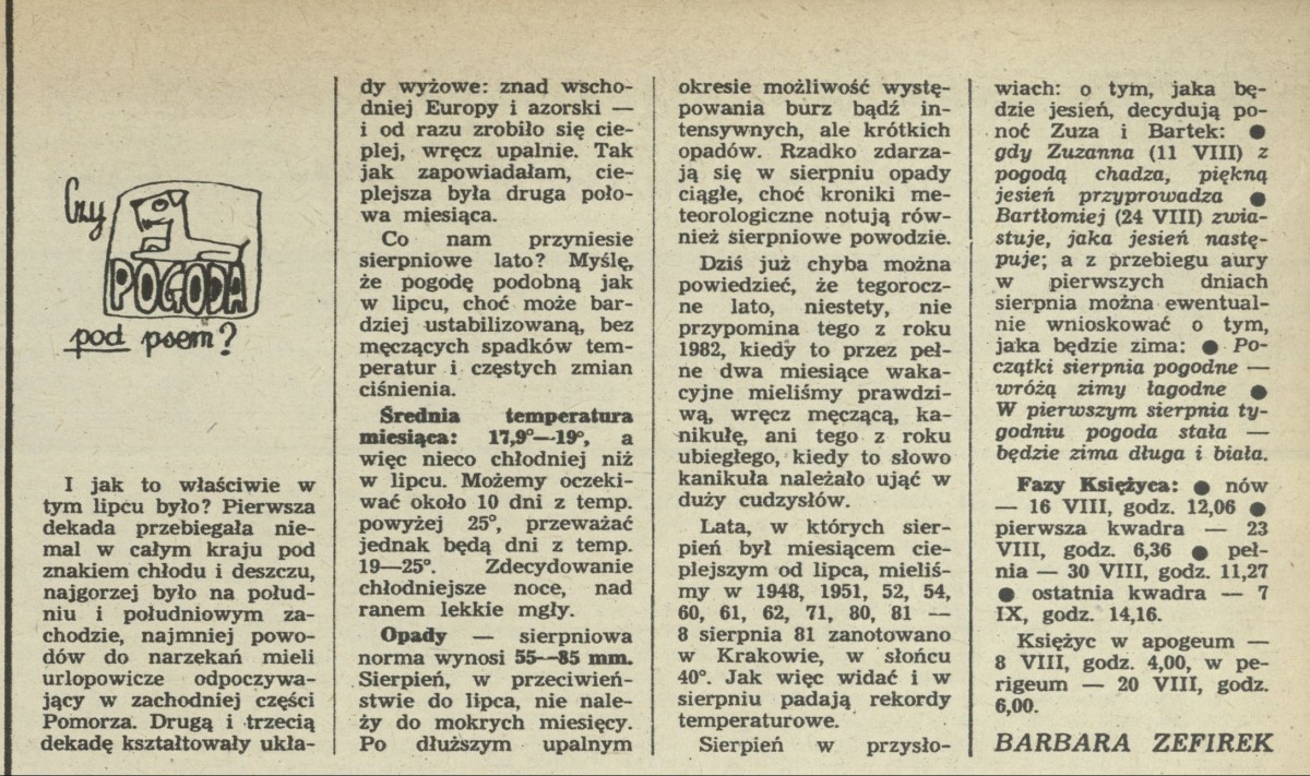 Archiwum / Czy pogoda pod psem? nr 2095 (31/1985) 63/118 Podziel się Tytuł Czy pogoda pod psem? Autor Barbara Zefirek Rubryka Czy pogoda pod psem? Artykuł z numeru 2095 (31/1985) Data wydania 4 sierpnia 1985 Tagi pogoda