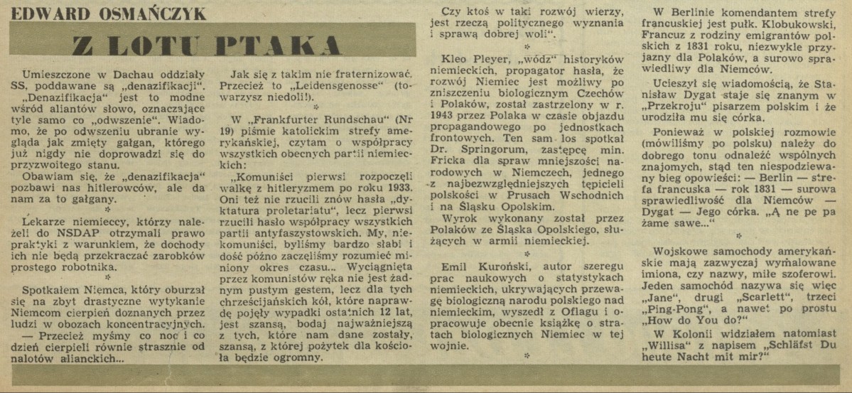 Archiwum nr 31 (31/1945) 685/123969 Podziel się Tytuł Z lotu ptaka Autor Edmund Osmańczyk Artykuł z numeru 31 (31/1945) Data wydania 11 listopada 1945