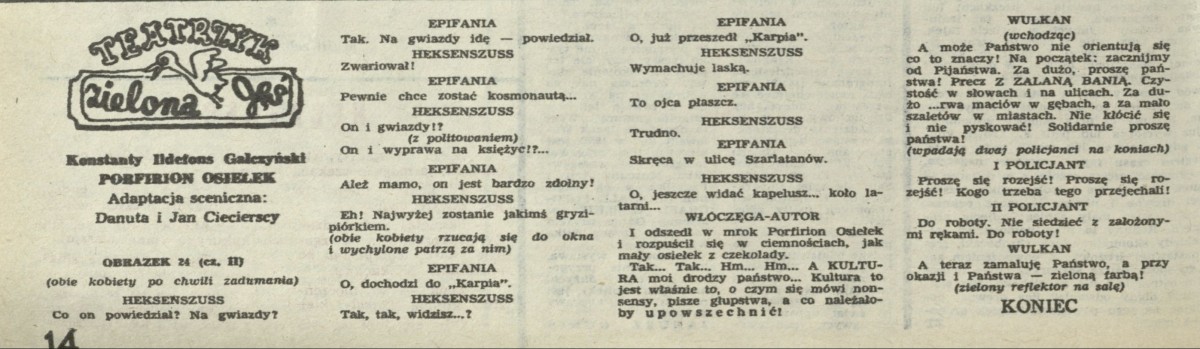 Archiwum / Teatrzyk Zielona Gęś nr 2100 (36/1985) 02/37 Podziel się Tytuł Porfirion Osiełek Autor Konstanty Ildefons Gałczyński Rubryka Teatrzyk Zielona Gęś Artykuł z numeru 2100 (36/1985) Data wydania 8 września 1985 Tagi groteska humor scenka rodzajowa gag