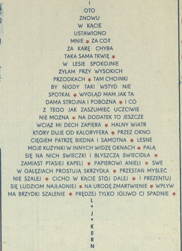 Archiwum / Rozmaitości [old] nr 1498 (51/1973) 52/53 Podziel się Tytuł I oto znowu Autor Ludwik Jerzy Kern Rubryka Rozmaitości [old] Artykuł z numeru 1498 (51/1973) Data wydania 23 grudnia 1973 Tagi święta święta bożego narodzenia choinka