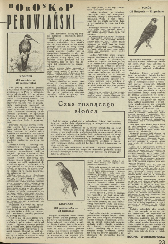 Archiwum / Rozrywka nr 2103 (39/1985) 129/178 Podziel się Tytuł Horoskop peruwiański Autor Bo Wer. Kategoria Rozrywka Artykuł z numeru 2103 (39/1985) Data wydania 29 września 1985 Tagi horoskop astrologia ptak inkowie