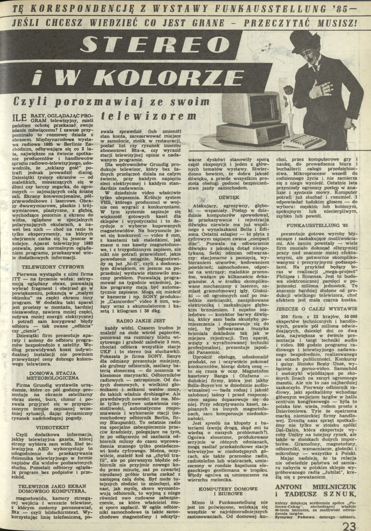 Archiwum / korespondencja własna "Przekroju" nr 2101 (37/1985) 21/27 Podziel się Tytuł Stereo i w kolorze Autor Antoni Mielniczuk Rubryka korespondencja własna "Przekroju" Artykuł z numeru 2101 (37/1985) Data wydania 15 września 1985 Tagi telewizor radio wystawa