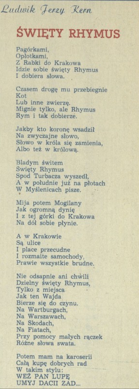 Archiwum / Rozmaitości [old] nr 1504 (05/1974) 47/51 Podziel się Tytuł Święty Rhymus Autor Ludwik Jerzy Kern Rubryka Rozmaitości [old] Artykuł z numeru 1504 (5/1974) Data wydania 3 lutego 1974