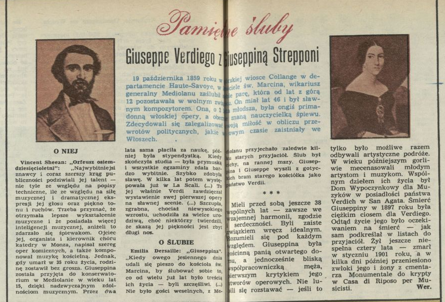 Archiwum / Artykuł nr 2108 (44/1985) 1/1 Podziel się Tytuł Pamiętne śluby Giuseppe Verdiego z Giuseppiną Strepponi Autor Wer. Kategoria Artykuł Artykuł z numeru 2108 (44/1985) Data wydania 3 listopada 1985 Tagi ślub historia