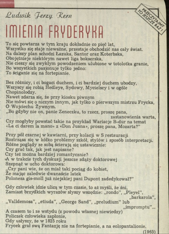 Archiwum / Rozmaitości [old] nr 2105 (41/1985) 86435/123969 Podziel się Tytuł Imienia Fryderyka Autor Ludwik Jerzy Kern Rubryka Rozmaitości [old] Artykuł z numeru 2105 (41/1985) Data wydania 13 października 1985