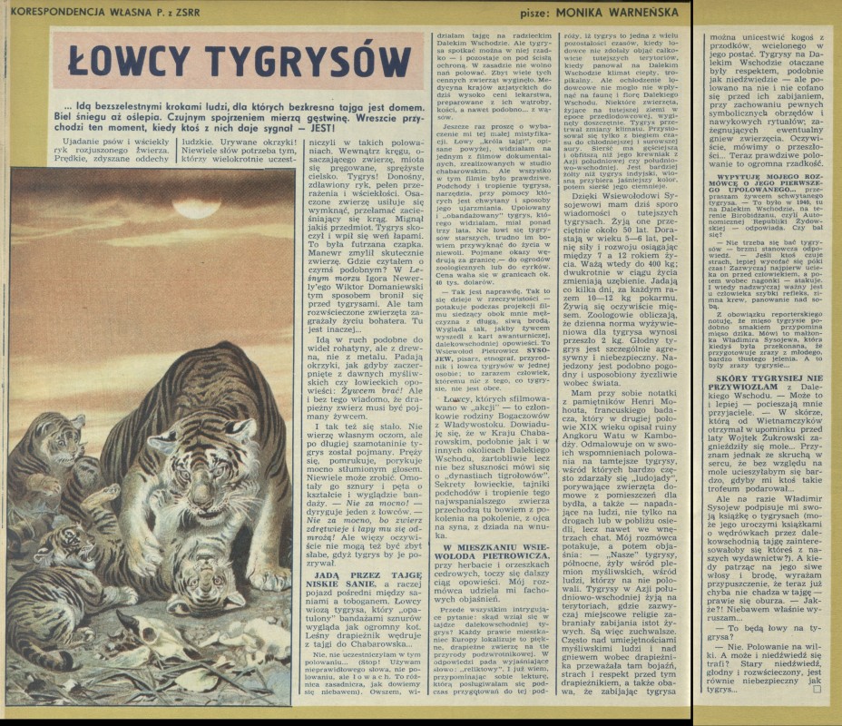 Archiwum / korespondencja własna "Przekroju" nr 1514 (15/1974) 780/2813 Podziel się Tytuł Łowcy tygrysów Autor Monika Warneńska Rubryka korespondencja własna "Przekroju" Artykuł z numeru 1514 (15/1974) Data wydania 14 kwietnia 1974 Tagi Rosja podróż
