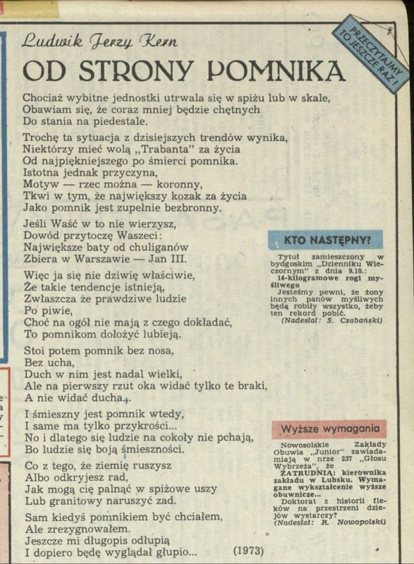 Archiwum / Rozmaitości [old] nr 2109 (45/1985) 44/325 Podziel się Tytuł Od strony pomnika Autor Ludwik Jerzy Kern Rubryka Rozmaitości [old] Artykuł z numeru 2109 (45/1985) Data wydania 10 listopada 1985
