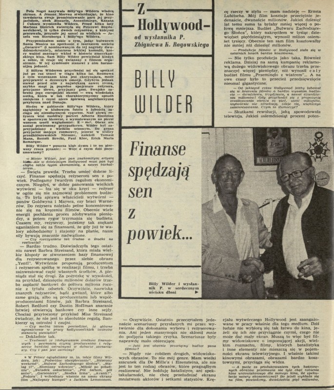 Archiwum / korespondencja własna "Przekroju" nr 2058 (47/1984) 183/2088 Podziel się Tytuł Z Holoywood Autor Zbigniew K. Rogowski Rubryka korespondencja własna "Przekroju" Artykuł z numeru 2058 (47/1984) Data wydania 18 listopada 1984 Tagi Billy Wilder finanse