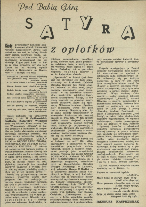 Archiwum / Artykuł nr 2077 (13/1985) 08/18 Podziel się Tytuł Pod Babią górą: Satyra z opłotków Autor Ireneusz Kasprzysiak Kategoria Artykuł Artykuł z numeru 2077 (13/1985) Data wydania 31 marca 1985 Tagi koncert babia góra