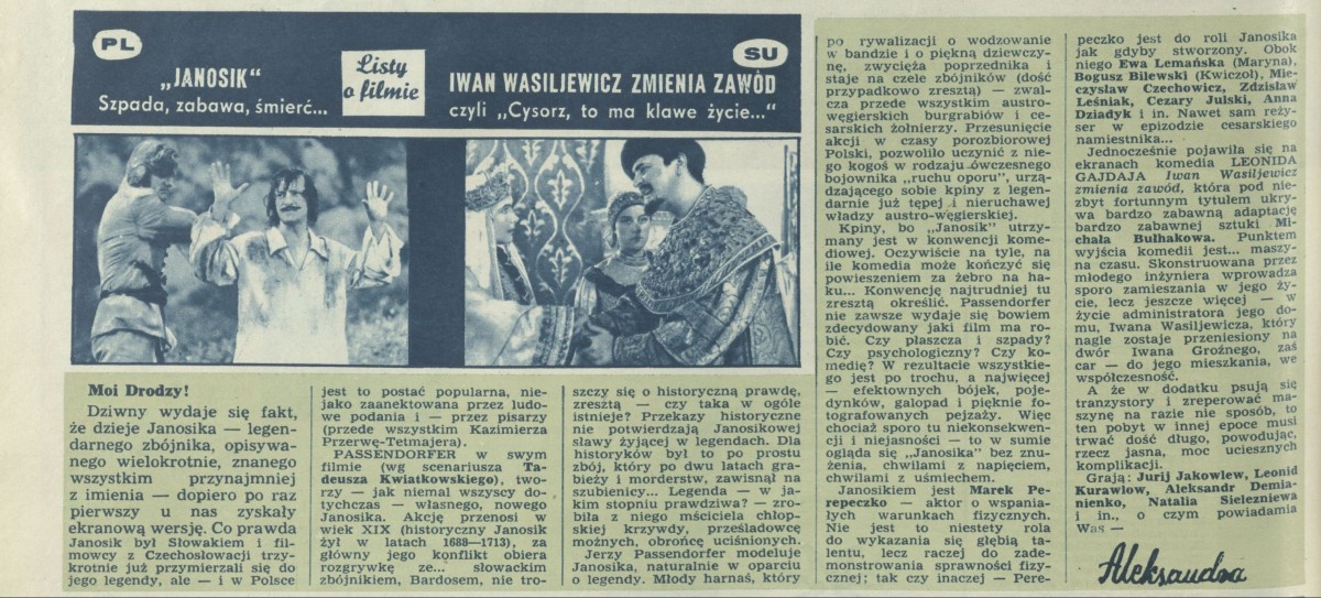 Archiwum / Listy o filmie nr 1518 (19/1974) 4/5 Podziel się Tytuł Janosik, Iwan Wasiljewicz zmienia zawód Autor Aleksandra Rubryka Listy o filmie Artykuł z numeru 1518 (19/1974) Data wydania 12 maja 1974