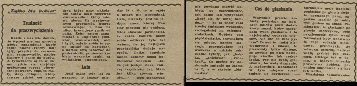 Archiwum / Tylko dla kobiet nr 45 (07/1946) 80/700 Podziel się Tytuł Tylko dla kobiet - trudność do przezwyciężenia Rubryka Tylko dla kobiet Artykuł z numeru 45 (7/1946) Data wydania 17 lutego 1946