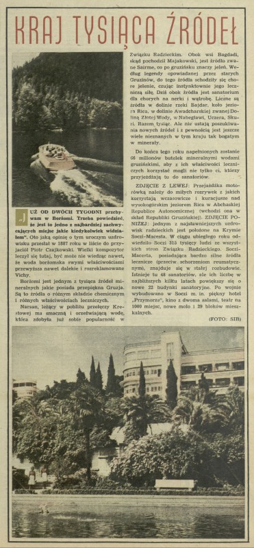 Archiwum / Artykuł nr 544 (37/1955) 34/58 Podziel się Tytuł Kraj tysiąca źródeł Autor SIB. Kategoria Artykuł Artykuł z numeru 544 (37/1955) Data wydania 11 września 1955 Tagi Gruzja Czajkowski