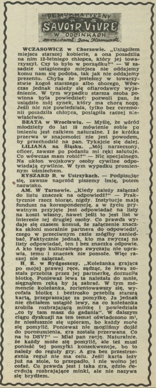 Archiwum / Demokratyczny savoir-vivre nr 544 (37/1955) 20712/123969 Podziel się Tytuł Dobre obyczaje wśród ludzi Autor Jan Kamyczek Rubryka Demokratyczny savoir-vivre Artykuł z numeru 544 (37/1955) Data wydania 11 września 1955 Tagi obyczaje kultura ustępowanie miejsca ukłon zasady gry