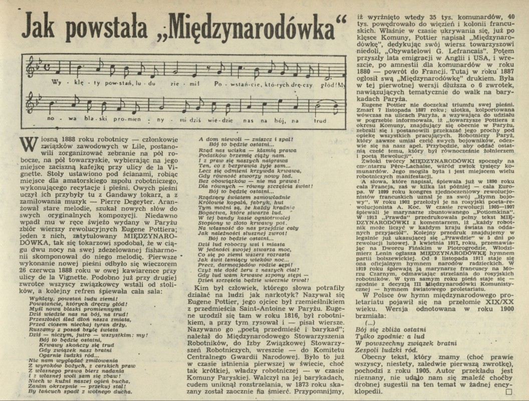 Archiwum / Artykuł nr 2081 (17/1985) 4/6 Podziel się Tytuł Jak powstała „Międzynarodówka” Kategoria Artykuł Artykuł z numeru 2081 (17/1985) Data wydania 28 kwietnia 1985 Tagi międzynarodówka powstanie