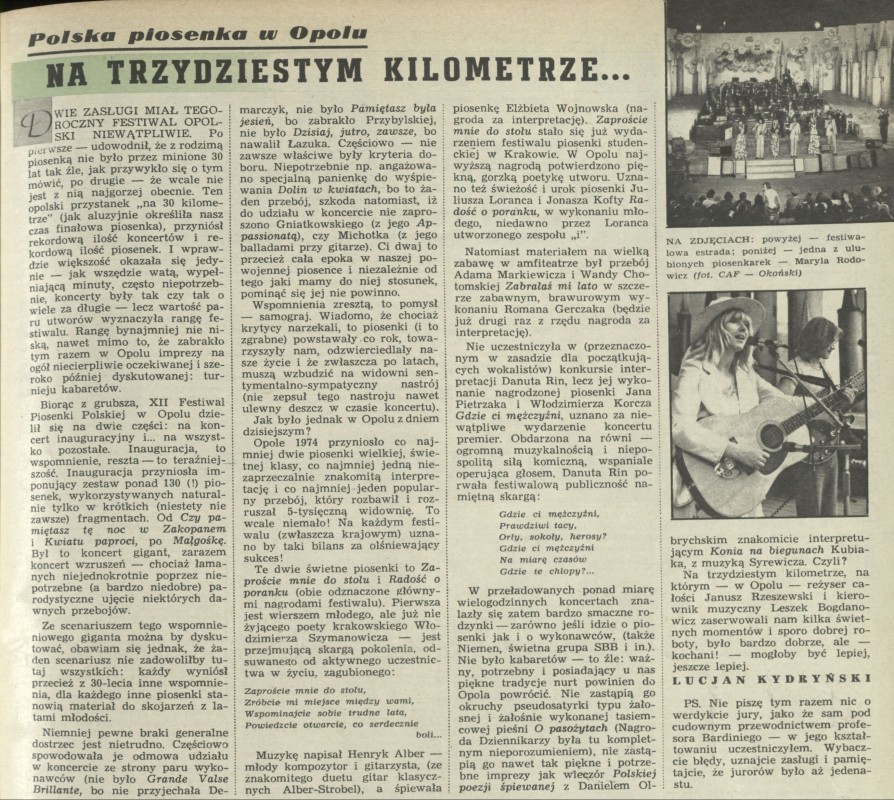 Archiwum / Artykuł nr 1526 (27/1974) 31/42 Podziel się Tytuł Na trzydziestym kilometrze... Autor Lucjan Kydryński Kategoria Artykuł Artykuł z numeru 1526 (27/1974) Data wydania 7 lipca 1974 Tagi muzyka festiwal kultura