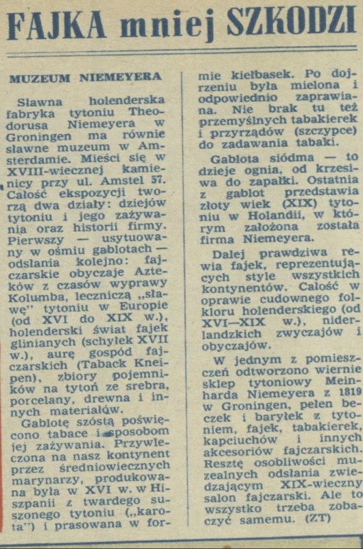 Archiwum / Fajka mniej szkodzi nr 1526 (27/1974) 07/20 Podziel się Tytuł Muzeum Niemeyera Autor Zbigniew Turek Rubryka Fajka mniej szkodzi Artykuł z numeru 1526 (27/1974) Data wydania 7 lipca 1974 Tagi palenie fajka fajczarze