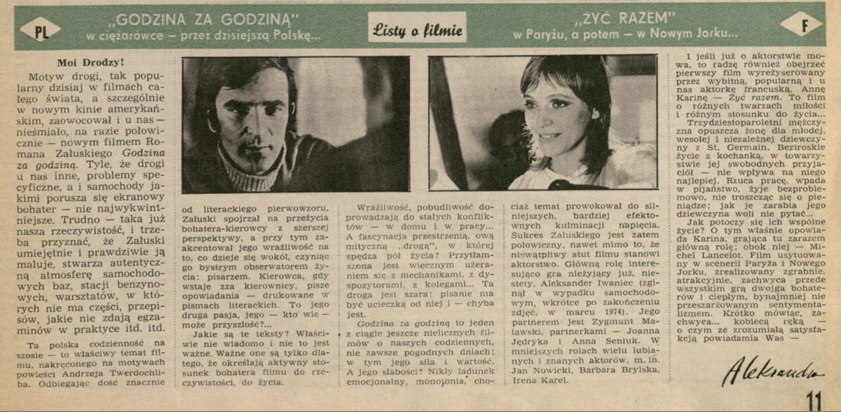 Archiwum / Listy o filmie nr 1552 (01/1975) 3/6 Podziel się Tytuł „Godzina za godziną”, „Żyć razem” Autor Aleksandra Rubryka Listy o filmie Artykuł z numeru 1552 (1/1975) Data wydania 5 stycznia 1975 Tagi kinematografia polska Załuski kinematografia francuska Anna Karina