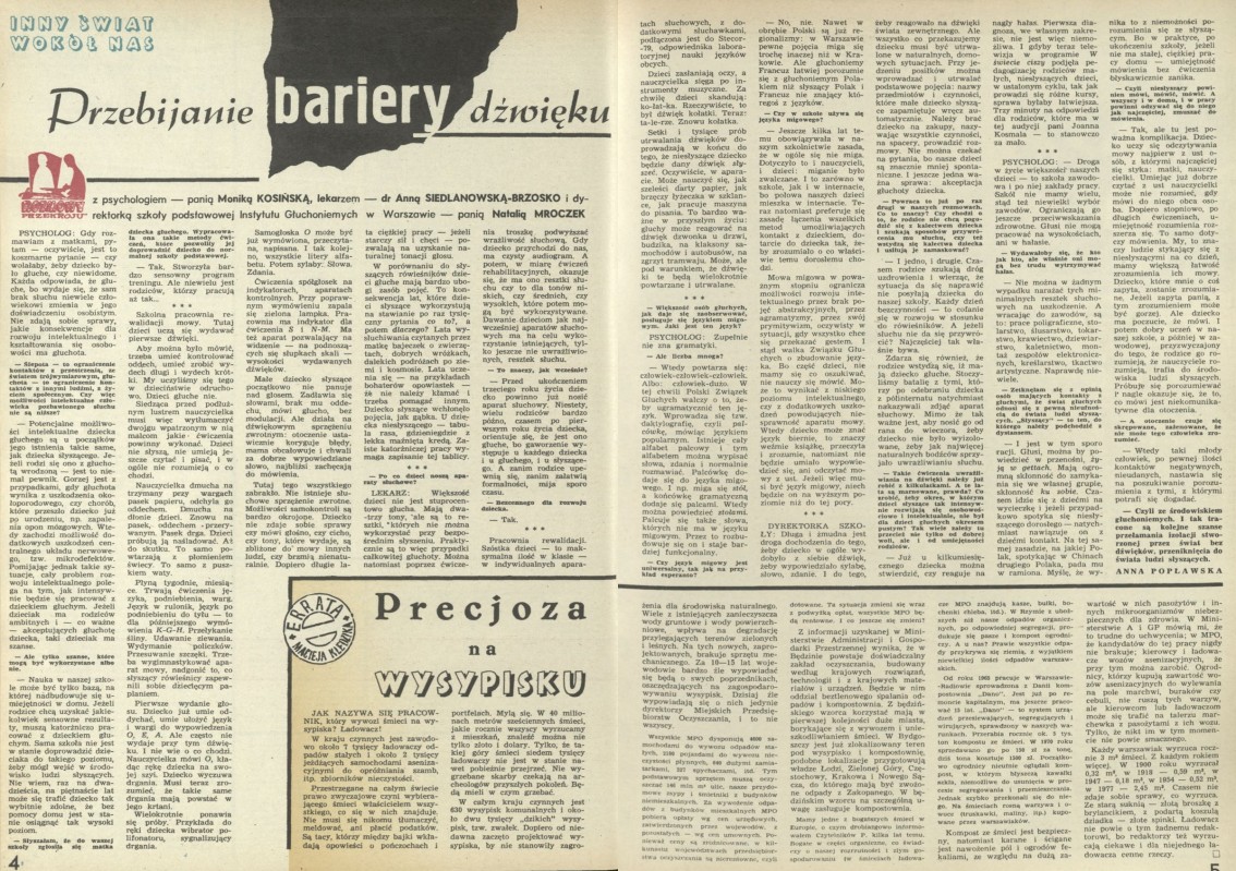 Archiwum / Rozmowy „Przekroju” nr 2074 (10/1985) 85170/123969 Podziel się Tytuł Przebijanie bariery dżwięku Autor Anna Popławska Rubryka Rozmowy „Przekroju” Artykuł z numeru 2074 (10/1985) Data wydania 10 marca 1985 Tagi głuchoniemy dżwięk