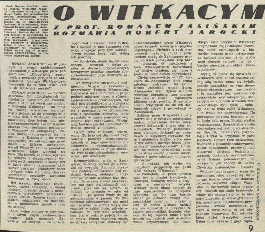 Archiwum / Rozmowy „Przekroju” nr 2072 (08/1985) 545/807 Podziel się Tytuł O Witkacym Autor Robert Jarocki Rubryka Rozmowy „Przekroju” Artykuł z numeru 2072 (8/1985) Data wydania 24 lutego 1985 Tagi Witkacy sztuka