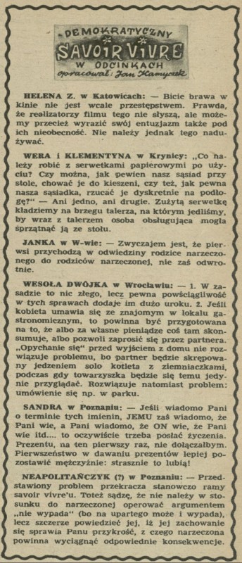 Archiwum / Demokratyczny savoir-vivre nr 311 (13/1951) 61/238 Podziel się Tytuł Demokratyczny savoir-vivre Autor Jan Kamyczek Rubryka Demokratyczny savoir-vivre Artykuł z numeru 311 (13/1951) Data wydania 25 marca 1951