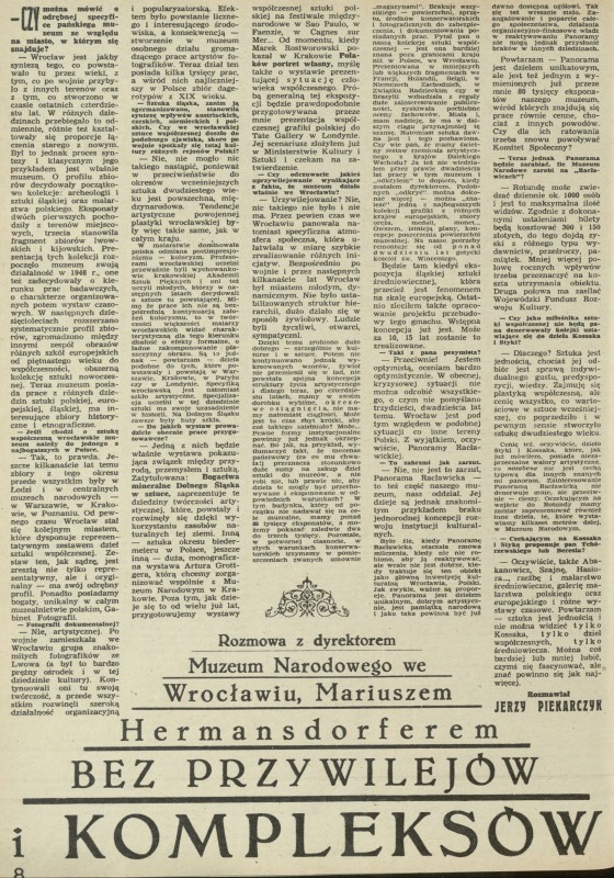 Archiwum / Rozmowy „Przekroju” nr 2096 (32/1985) 65/98 Podziel się Tytuł Bez przywilejów i kompleksów Autor Jerzy Piekarczyk Rubryka Rozmowy „Przekroju” Artykuł z numeru 2096 (32/1985) Data wydania 11 sierpnia 1985 Tagi Mariusz Hermansdorfer Muzeum Narodowe we Wrocławiu