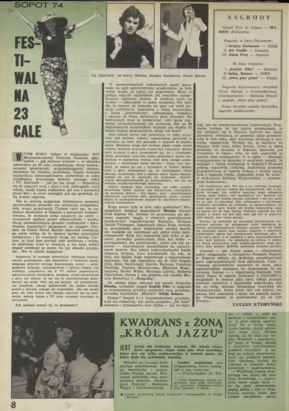 Archiwum / Artykuł nr 1534 (35/1974) 09/23 Podziel się Tytuł Festiwal na 23 cale Autor Lucjan Kydryński Kategoria Artykuł Artykuł z numeru 1534 (35/1974) Data wydania 1 września 1974 Tagi Sopot 74