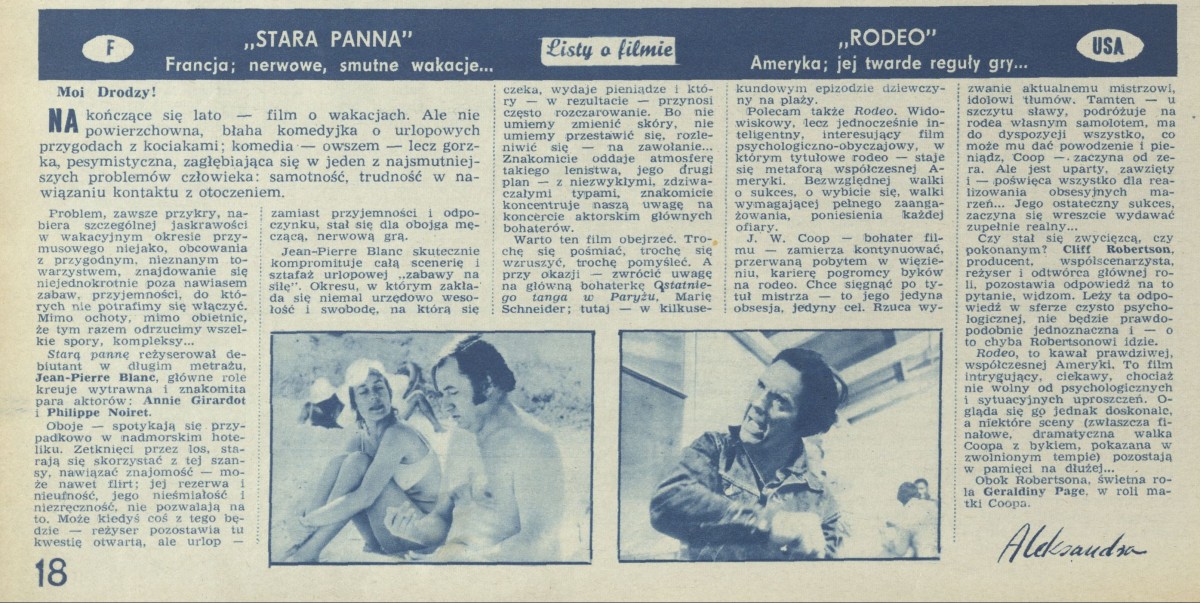 Archiwum / Listy o filmie nr 1533 (34/1974) 64372/123969 Podziel się Tytuł Stara panna, Rodeo Autor Aleksandra Rubryka Listy o filmie Artykuł z numeru 1533 (34/1974) Data wydania 25 sierpnia 1974